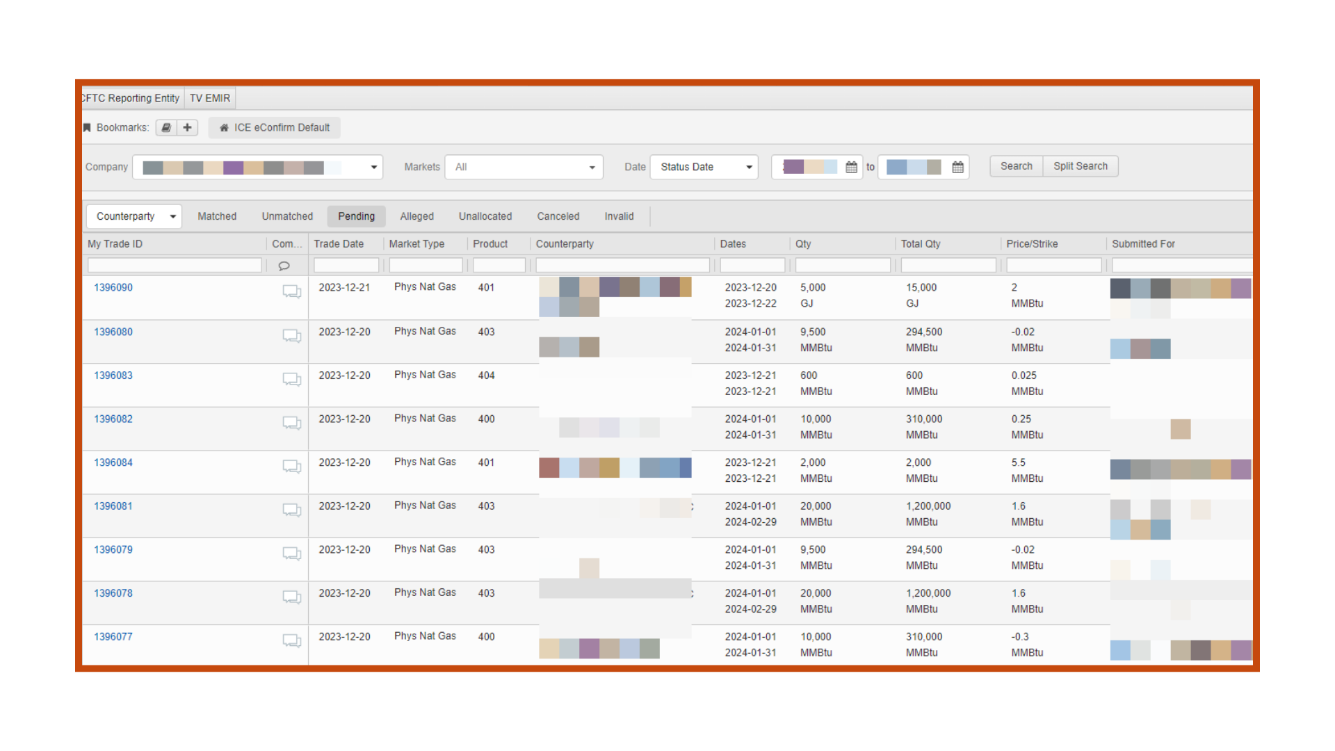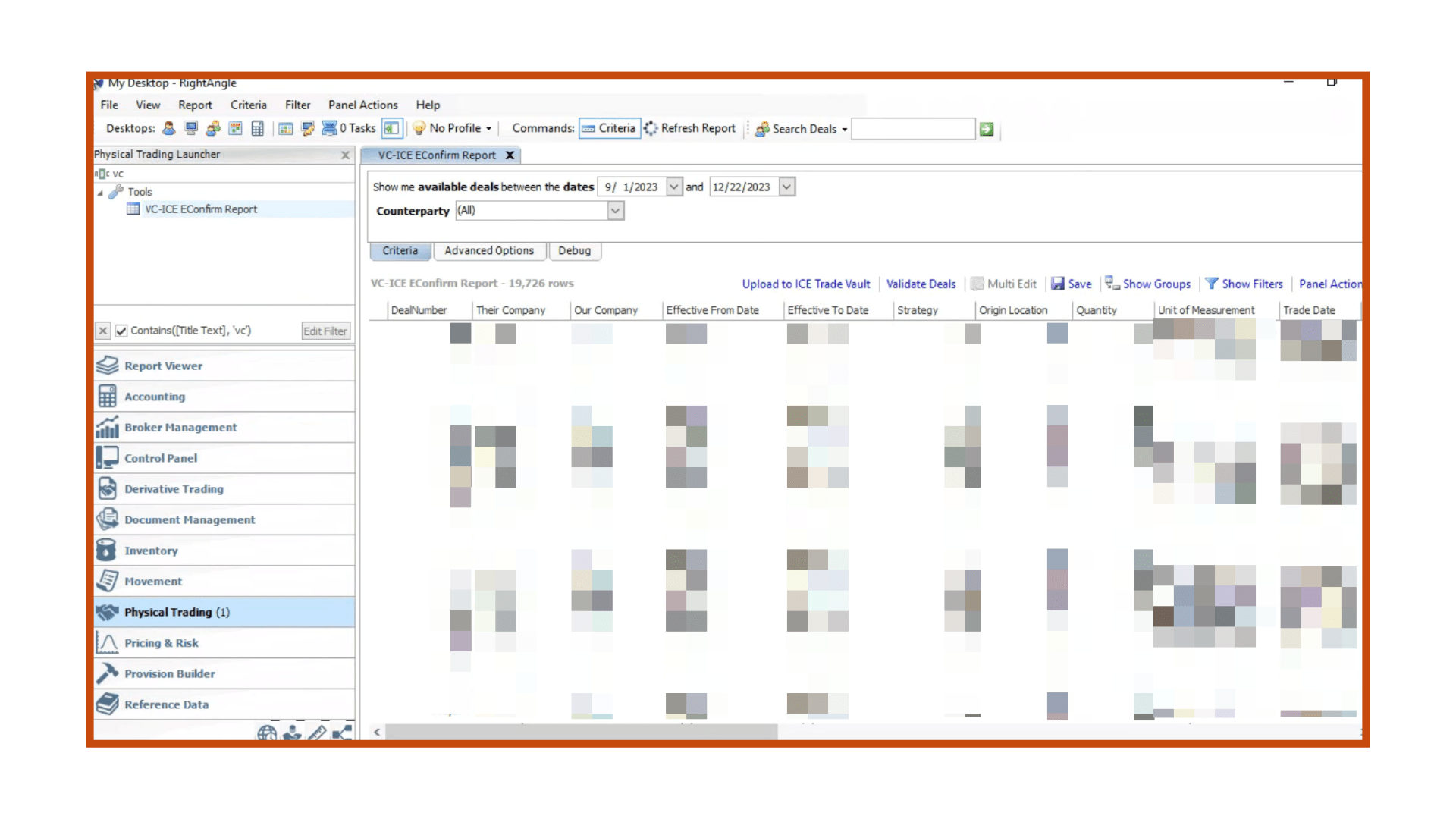 ICE Tade Vault eConfirm is a tailored solution designed specifically for commodity trading firms aiming to streamline their trade confirmation processes through electronic means. Our Custom Solution enables a seamless eConfirm process with the ICE Trade Vault and answers our client’s reconciliation and reporting requirements by seamlessly integrating RightAngle with ICE Trade Vault. This integration solution is facilitated by a customized RightAngle Editable Report and Interface, utilizing the eConfirm API provided by ICE to connect with the ICE Trade vault. Through this comprehensive approach, we effectively manage and control the trade confirmation process within RightAngle, significantly minimizing the need for manual intervention in matching trade confirmations.