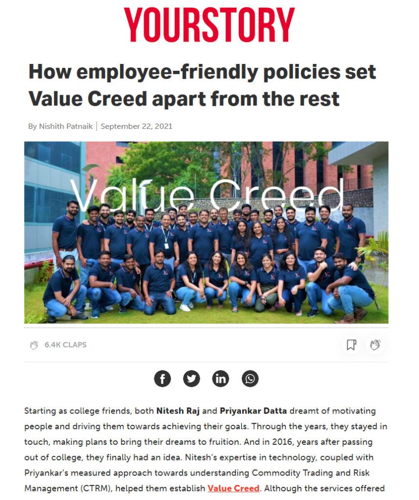 Value Creed is proud to be recognized as the most “Employee Friendly Workplace” in the domain of the commodity trading and risk management technology sector. In a recent interview with Value Creed’s leadership, YourStory.com, India’s #1 Entrepreneurial Publication, quickly discovered the hyper-growth consulting firm’s key to success has been its dedication to cultivating a distinguished employee-first approach to corporate culture.