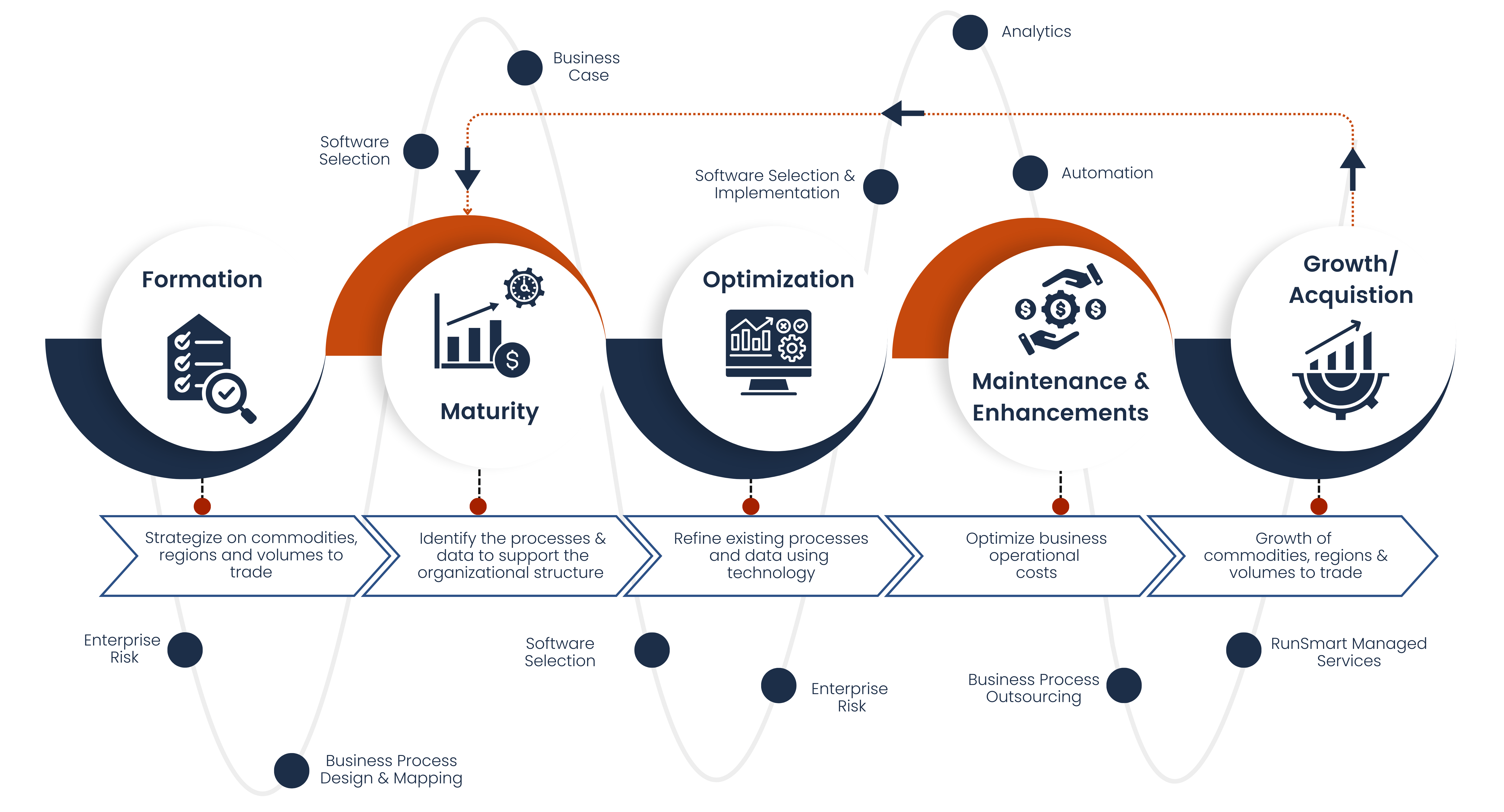 The Commodity Business Operation Lifecycle (CBOL) encompasses developing a business & technology infrastructure for trading commodities in various regions while reducing operational costs by establishing organizational structure, processes & data.